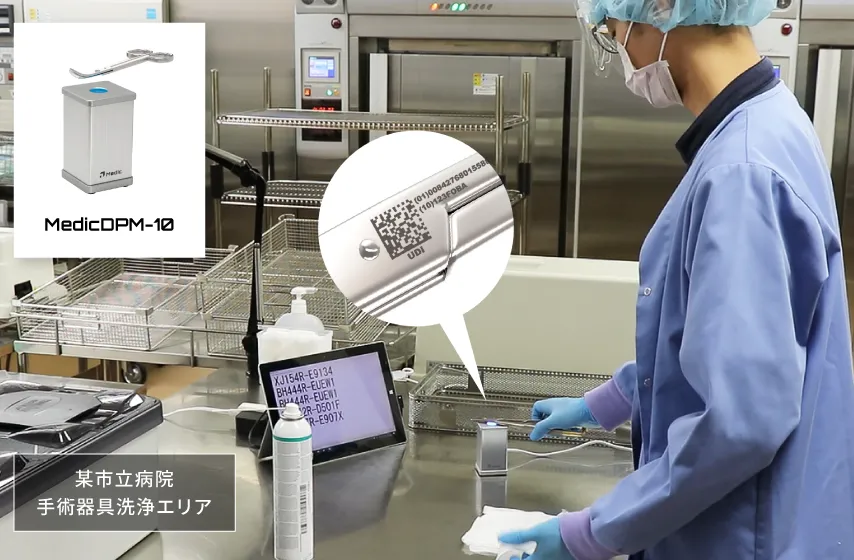 某市立病院の洗浄エリアでMedicDPMシリーズを活用し、手術用医療器具に刻印されたDataMatrixコードを高速かつ高精度に読み取り。作業効率とトレーサビリティが大幅に向上。