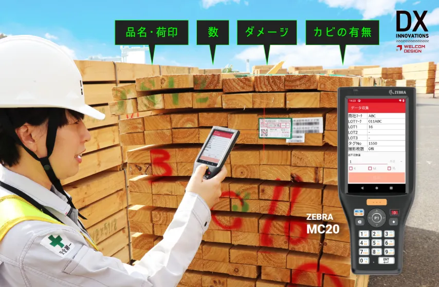 Zebraのハンディターミナルと専用アプリを使い、製材の数量とダメージを現場で即スキャン→自動リチェックレポート生成を実現。従来3~4時間かかっていたレポート作成が約10分に短縮、転記ミスも99%削減。