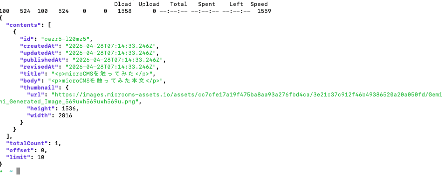 { "contents": [ { "id": "oazr5-l20mz5", "createdAt": "2026-04-28T07:14:33.246Z", "updatedAt": "2026-04-28T07:14:33.246Z", "publishedAt": "2026-04-28T07:14:33.246Z", "revisedAt": "2026-04-28T07:14:33.246Z", "title": "<p>microCMSを触ってみた</p>", "body": "<p>microCMSを触ってみた本文</p>", "thumbnail": { "url": "https://images.microcms-assets.io/...", "height": 1536, "width": 2816 } } ], "totalCount": 1, "offset": 0, "limit": 10 }