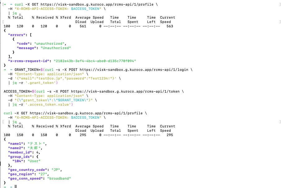 GRANT_TOKEN=$(curl -s -X POST .../login \ -d '{"email":"test@co.jp","password":"Test1234!"}' | jq -r '.grant_token') ACCESS_TOKEN=$(curl -s -X POST .../token \ -d "{\"grant_token\":\"$GRANT_TOKEN\"}" | jq -r '.access_token.value') curl -X GET .../profile \ -H "X-RCMS-API-ACCESS-TOKEN: $ACCESS_TOKEN"