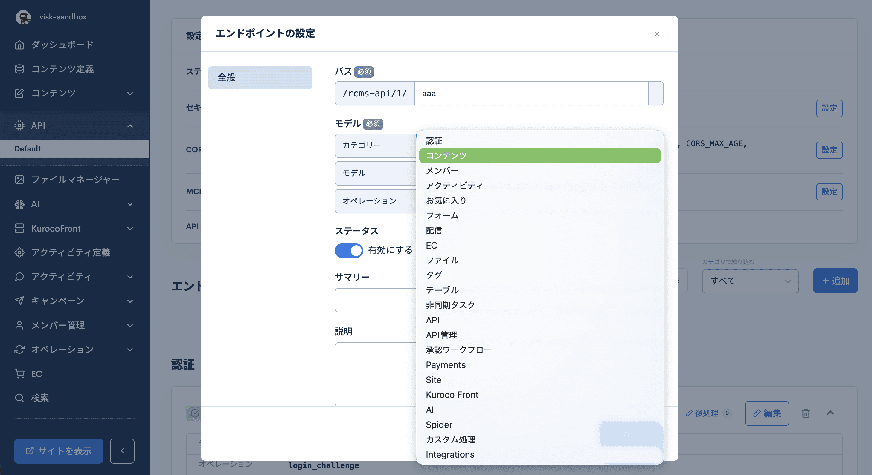 「EC」「Payments」「承認ワークフロー」「非同期タスク」が標準で並んでいるのを見て、これはコンテンツ管理ツールというより、APIプラットフォームだなと認識を改めました。