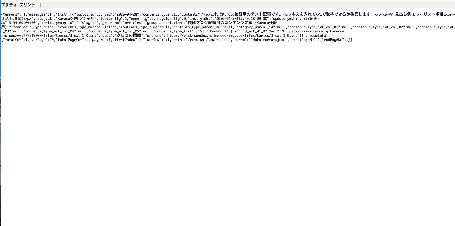 { "errors": [], "messages": [], "list": [ { "topics_id": 3, "subject": "Kurocoを触ってみた", "ymd": "2026-04-28", "thumbnail": { "url": "https://visk-sandbox.g.kuroco-img.app/v=1777349709/files/topics/3_ext_1_0.png" }, ... } ], "pageInfo": { "totalCnt": 1, "perPage": 20, ... } }