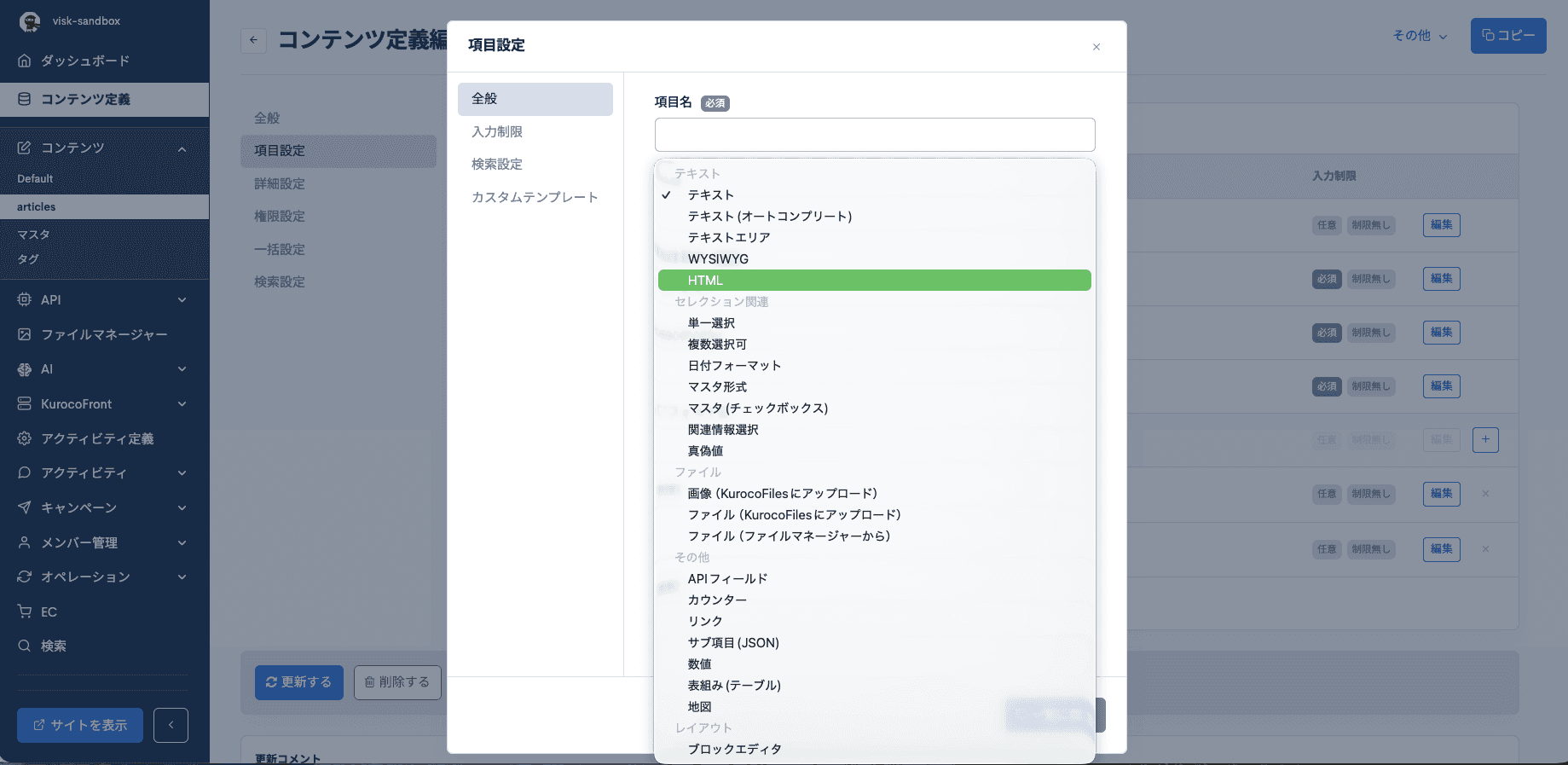 「項目設定」モーダルでフィールド型のドロップダウンを開くと、ざっと21種類くらい並んでいました。カテゴリ別にこんな構成。
