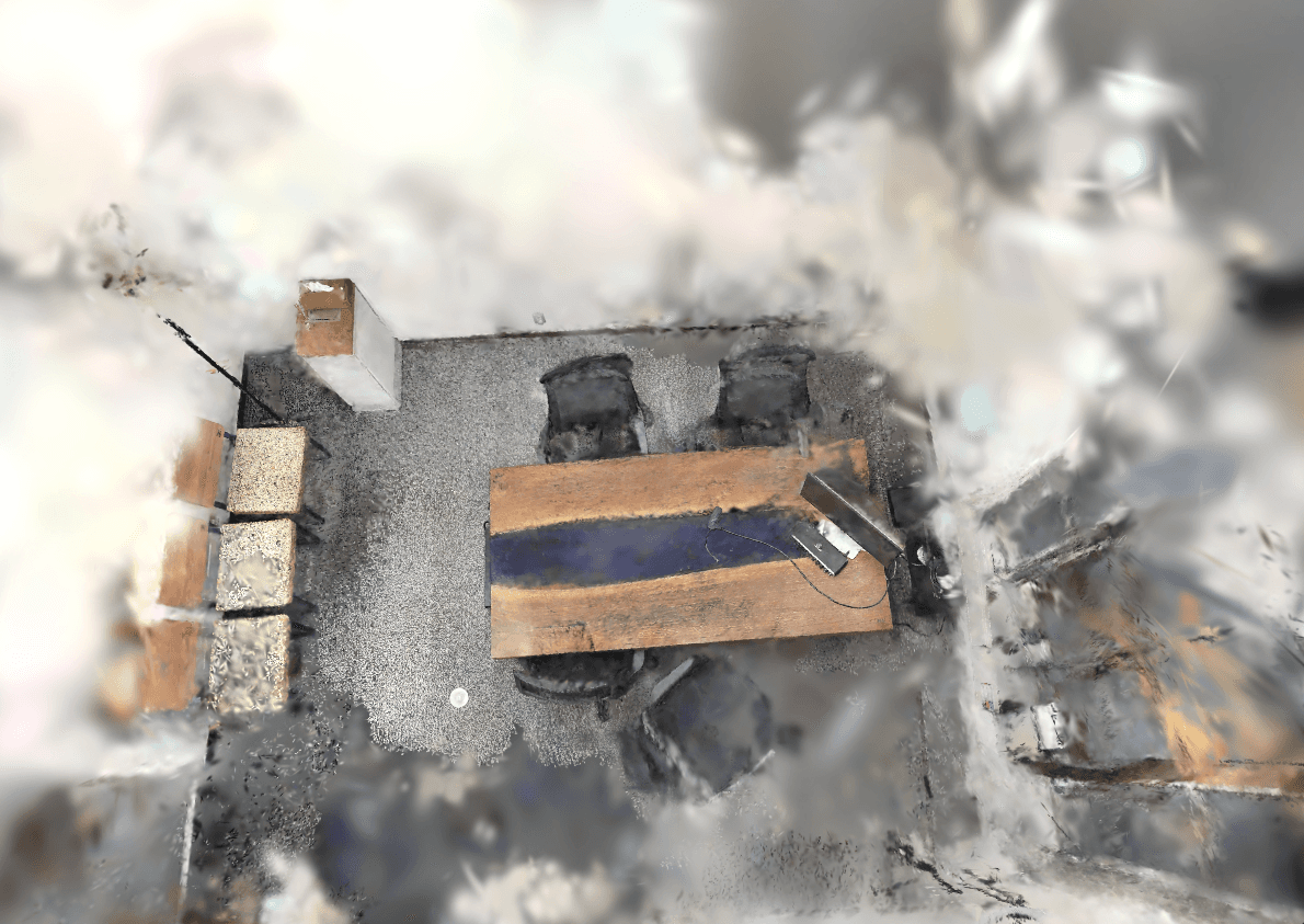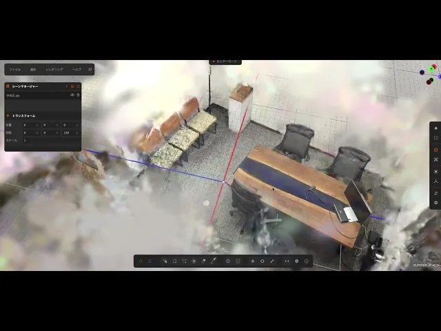 数日後、オフィスに出社した際に「そうだ、会議室があるじゃないか」と思い立った。整理された空間なら多少ガビガビでも見栄えはマシになるはず。Scaniverseで会議室を一周スキャンして、PLY形式でエクスポート。AirDropでMacに送って、SuperSplatのエディターにドラッグ&ドロップ。