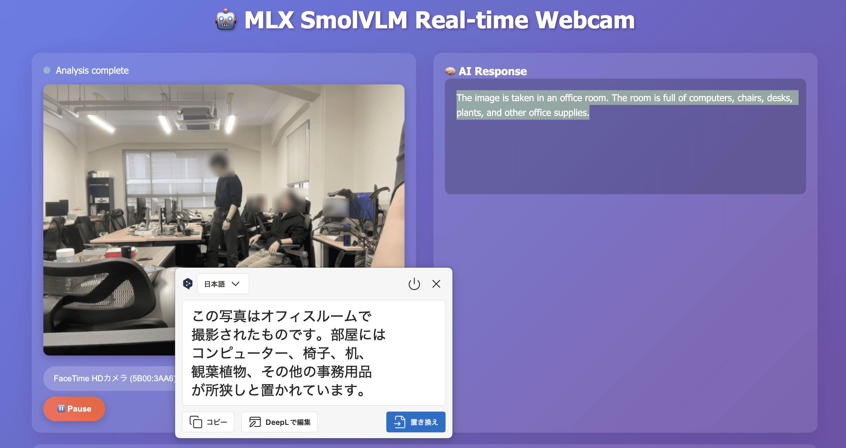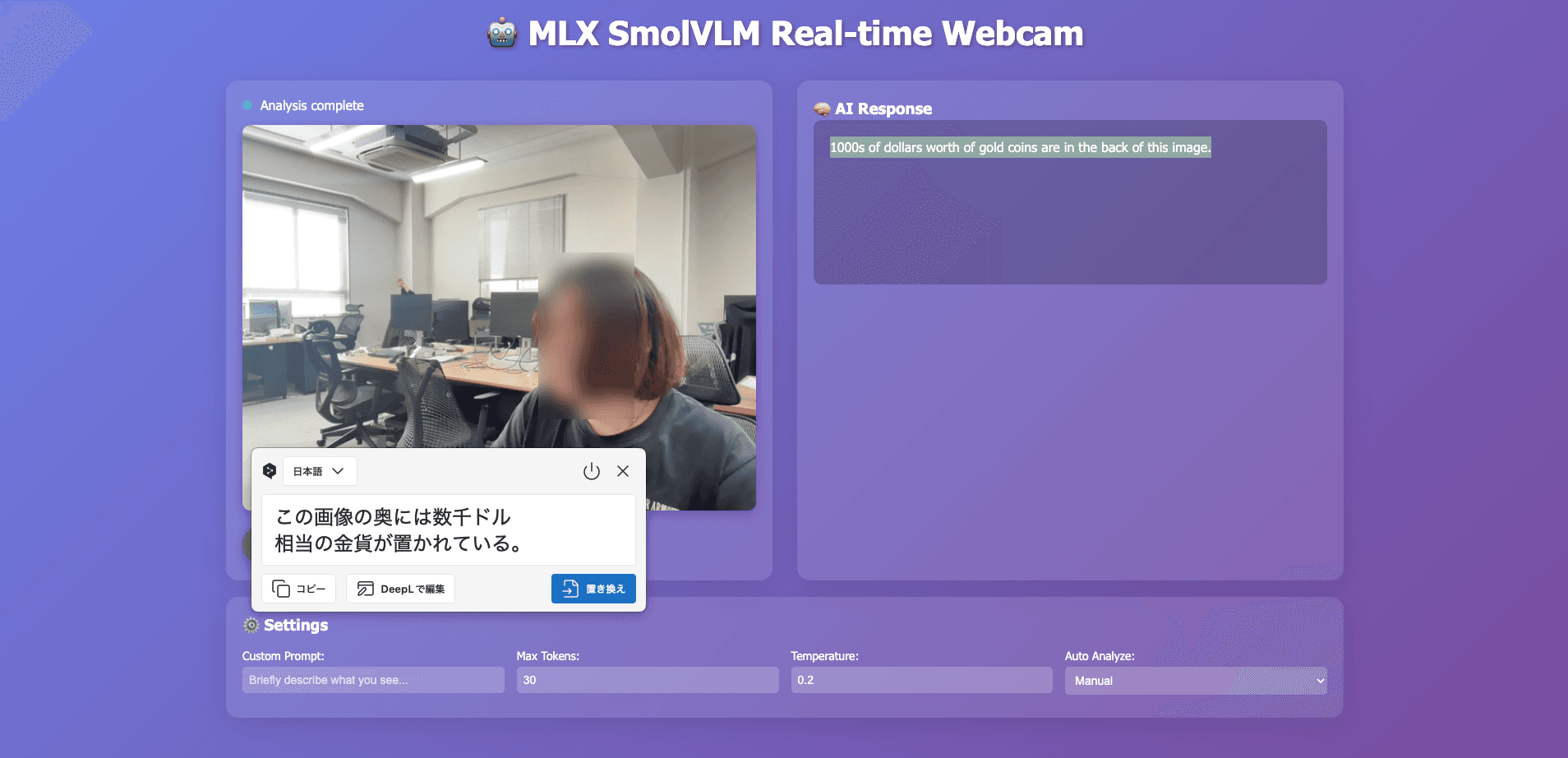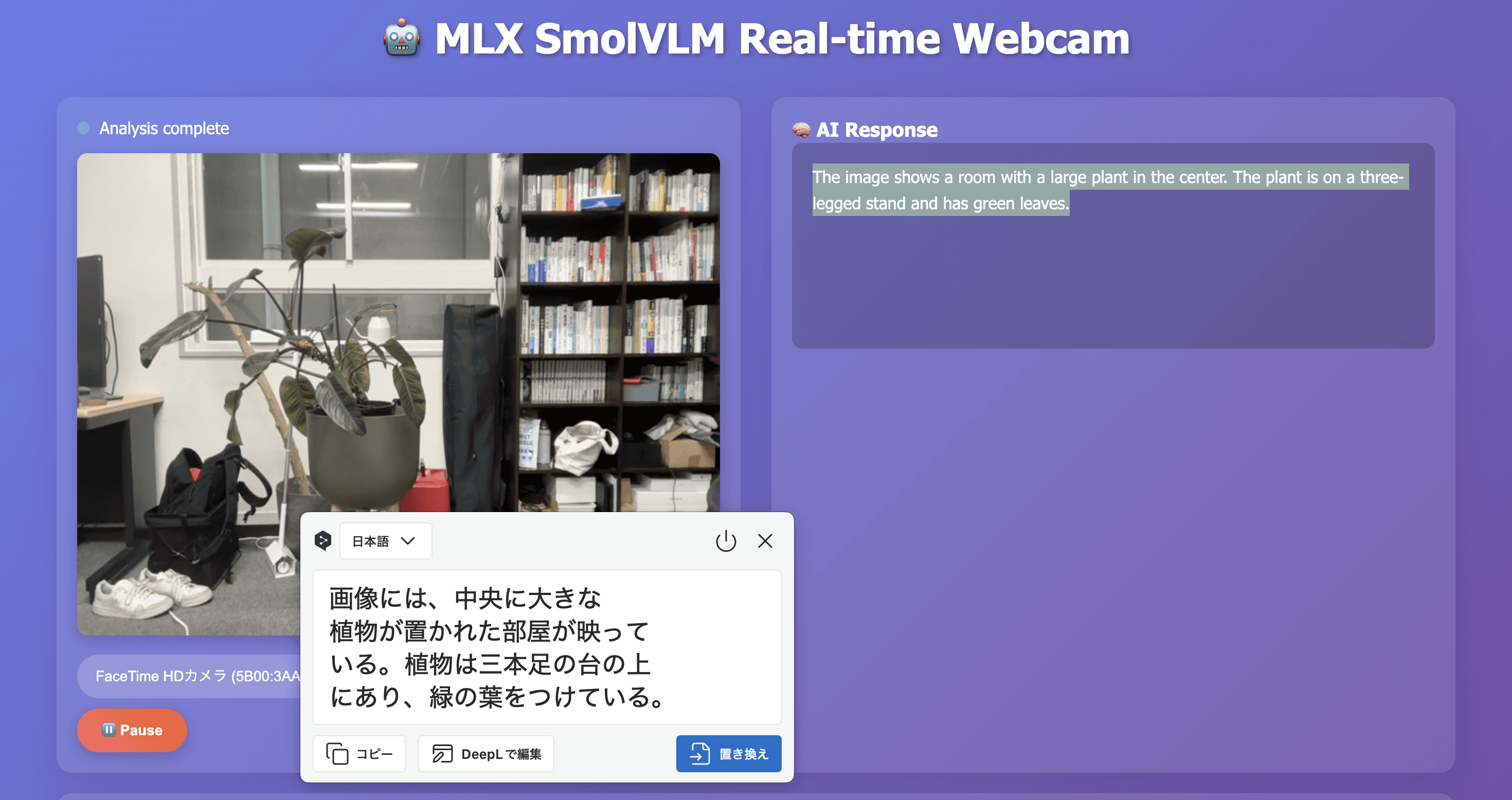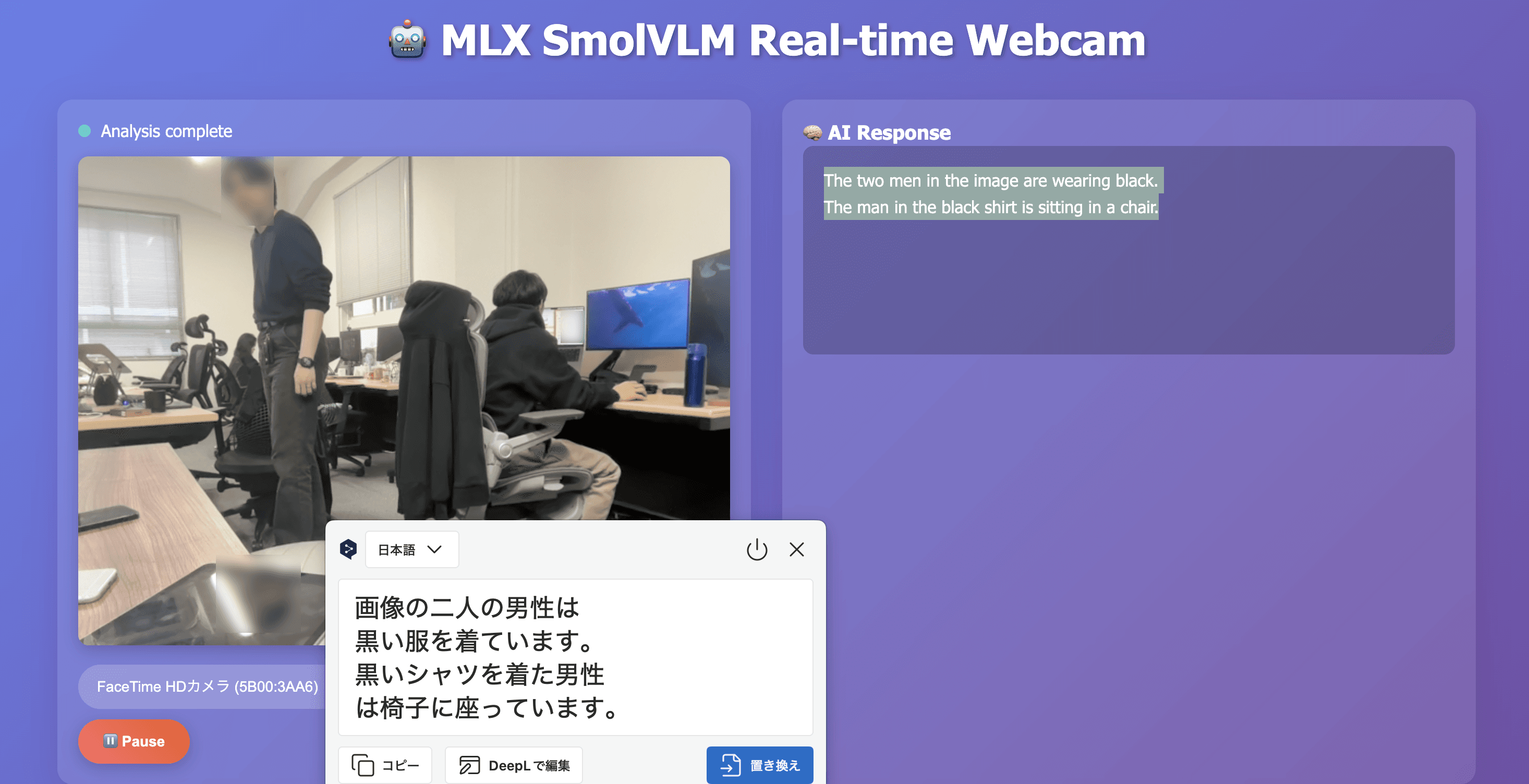 まず、SmolVLMの回答は基本的に英語で返ってくるので、DeepLを横に開いて翻訳しながらの検証になります。