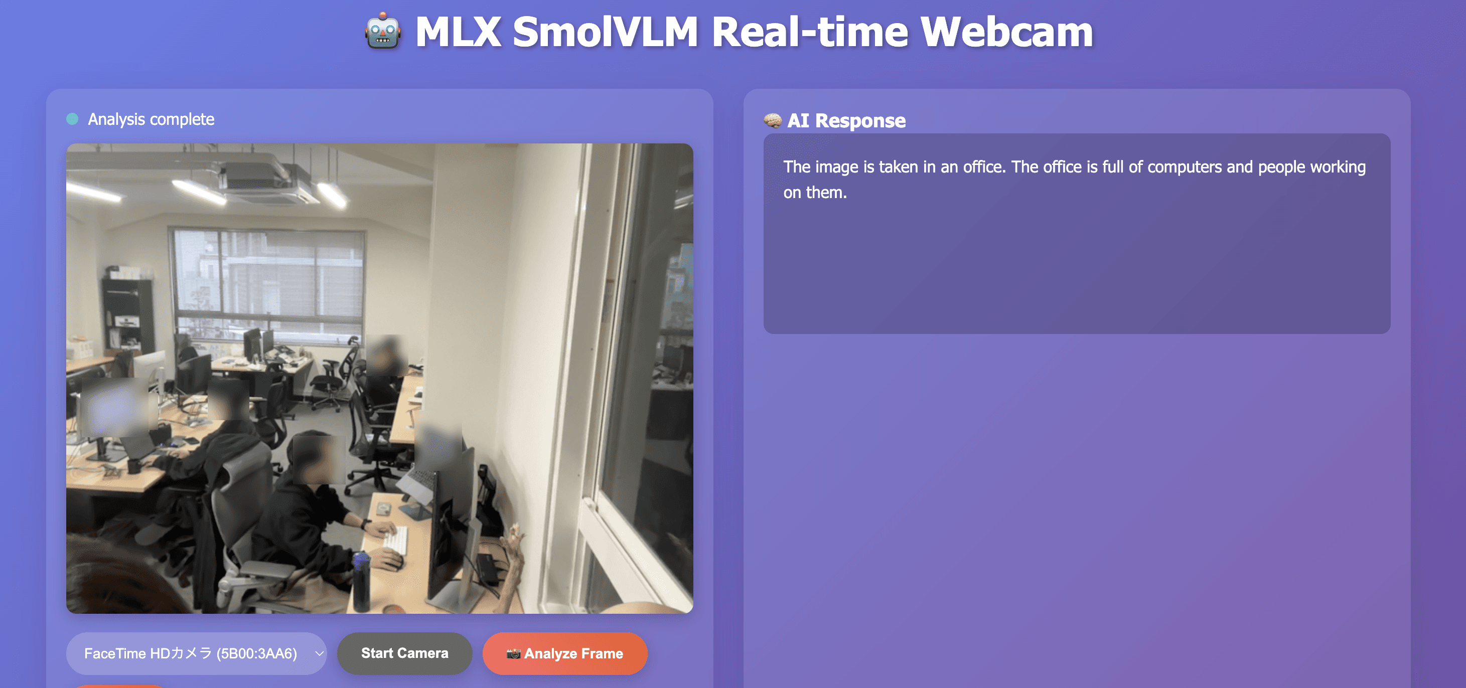 今回検証したのは、Hugging Faceが公開している SmolVLM-realtime-webcam。わずか500Mパラメータという超軽量モデルで、Webカメラの映像をAIがリアルタイムで認識・解説してくれるデモアプリです。