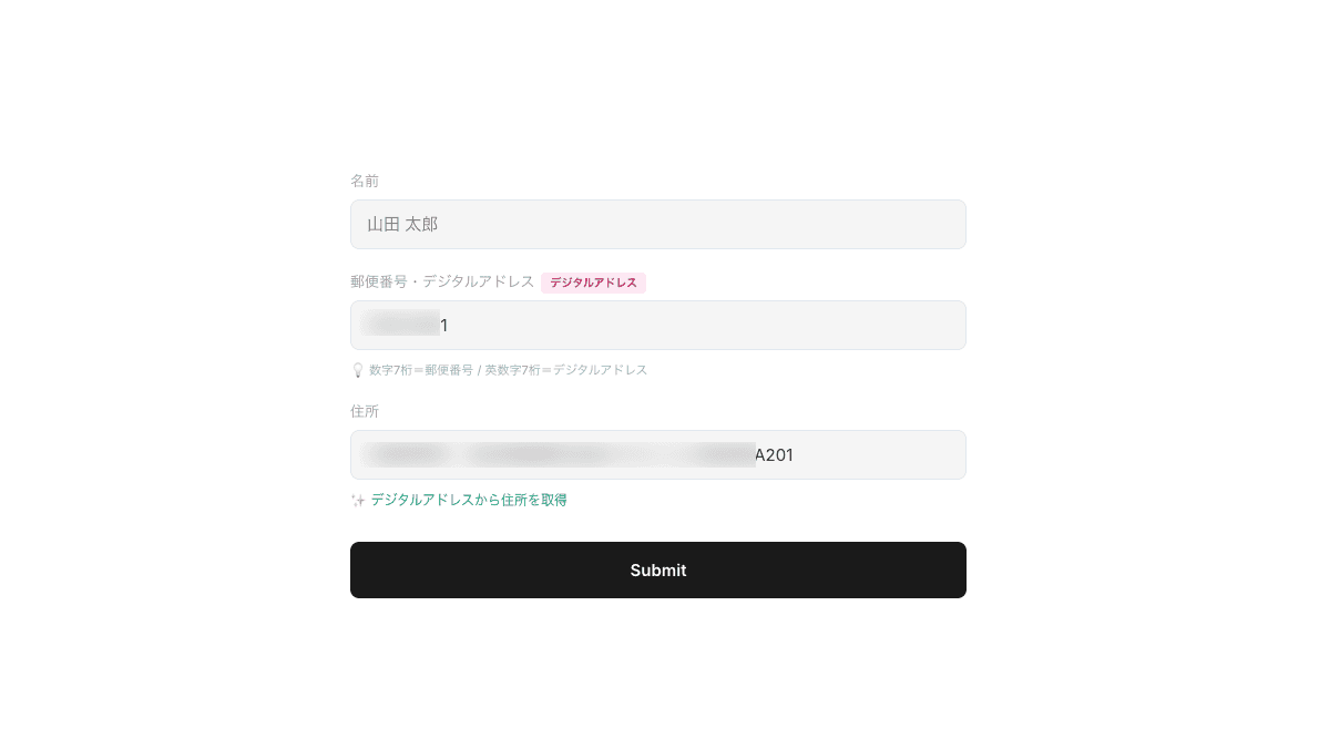 2025年5月にスタートしたばかりのサービスなので、ユーザー側がまだデジタルアドレスを持っていないケースが多いです。当面は「郵便番号も使える」併用フォームにしておくのが現実的。