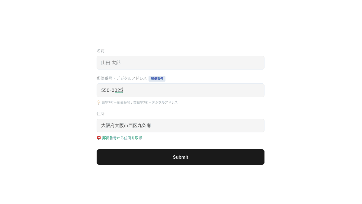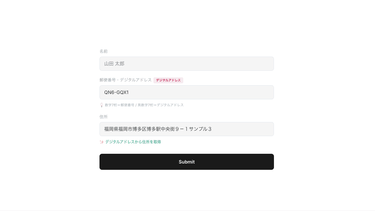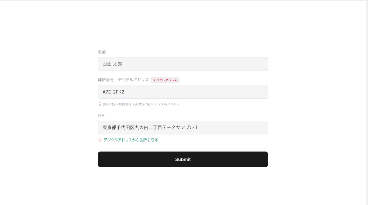 つまり、1つの API で郵便番号もデジタルアドレスも両方使える。フォームに「郵便番号またはデジタルアドレス」という入力欄を1つ置くだけで、ユーザーがどっちを入れても住所が自動入力される、という体験が作れます。