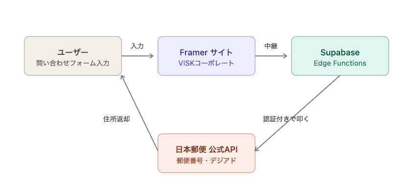 構成は Framer + Supabase Edge Functions + 日本郵便 API