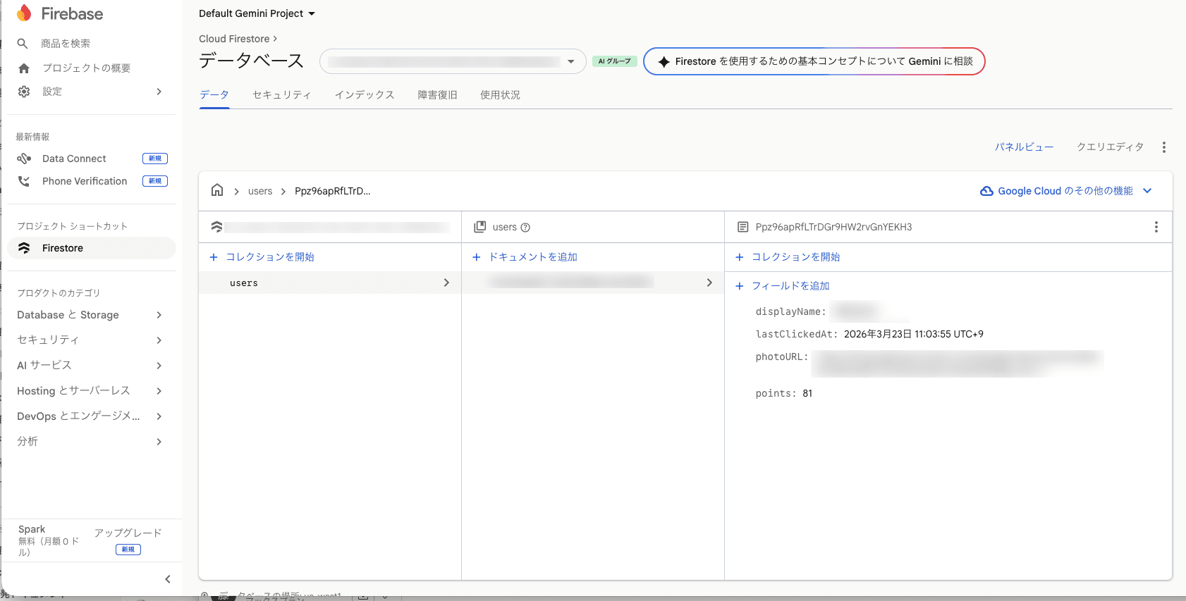 Firebaseコンソールを開くと、AIが自動生成した「Default Gemini Project」が存在し、Firestoreにはゲームのスコアデータがきちんと永続化されている。プロンプトしか書いていないのに、本物のバックエンドがそこにあった。