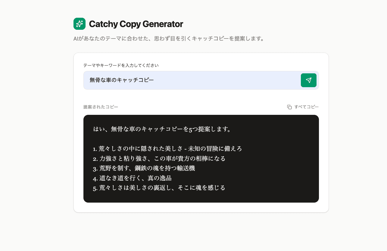 3つ目の検証は、Secrets Manager。「OpenAI APIでキャッチコピーを生成するアプリを作って。APIキーは絶対に直書きしないで」と指示した。