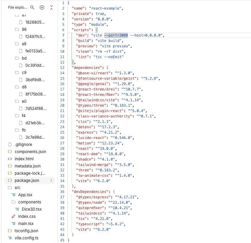 生成された package.json を覗くと、Three.js本体だけでなく、Reactでの利用に最適な @react-three/fiber や @react-three/drei といったラッパーライブラリまで自律的に選定されていた。Framer Motionについても、最新版でパッケージ名が motion に変わっていることを踏まえた上で正しく導入されている。