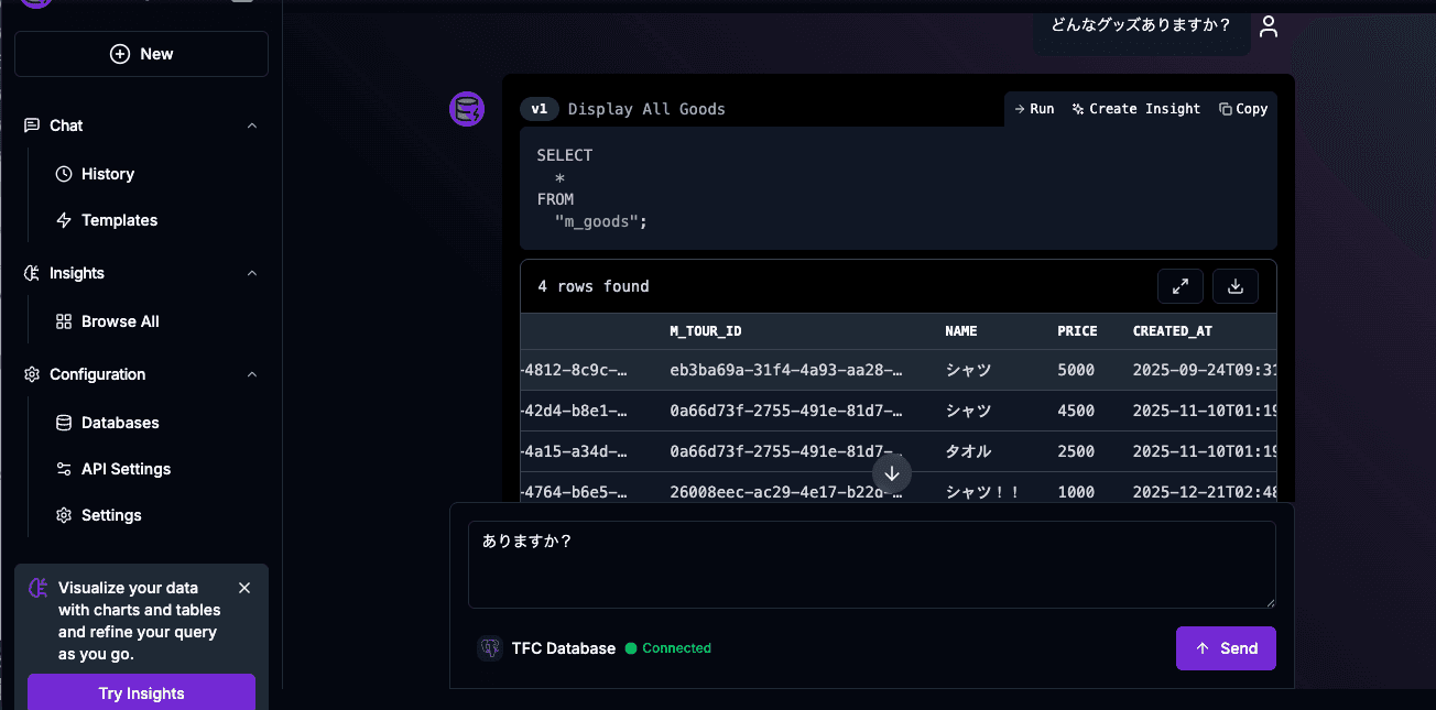 「先月のイベント一覧を見せて」——こんなふうに日本語で聞くだけで、AIがSQLクエリを自動生成して、データベースから結果を返してくれる。そんな「Text to SQL」の世界が、思っていた以上に実用レベルになってきています。