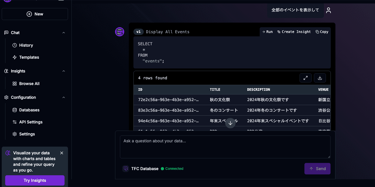 日本語で「全部のイベントを表示して」と入力したところ、生成されたSQLは: