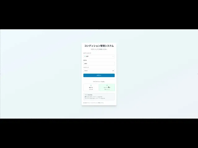 コンディション把握システムは、スポーツチームの選手の日々のコンディションを一元管理するWebベースのシステムです。選手の体重、睡眠、疲労度、怪我などの健康状態をリアルタイムで記録・可視化し、トレーナーやコーチが選手のコンディションを総合的に把握・管理できるプラットフォームです。選手個別のデータ管理からチーム全体の統計分析まで、スポーツパフォーマンス向上に必要なデータ基盤を提供します。