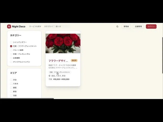 ホステス、キャバクラ、ホストなどのナイトワーカーと、シャンパンタワー、花束、バルーン装飾、衣装レンタル、出張撮影などの装飾系事業者をつなぐマッチングプラットフォームです。ユーザーは簡単に希望のサービスを検索・比較でき、事業者は効率的に顧客にリーチできます。