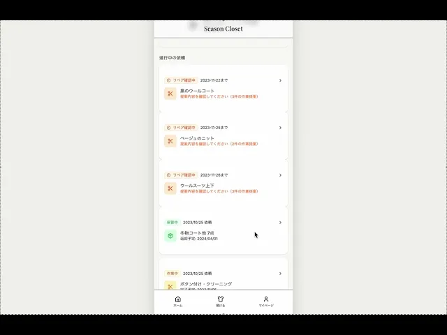 Season Closetは、衣類の保管とリペア(修繕)サービスを一体化したサブスクリプション型プラットフォームです。ユーザーはスマートフォンアプリから簡単に衣類の預け入れ依頼を行い、必要に応じてリペア・メンテナンスも同時に依頼できます。管理者向けのWeb管理画面では、依頼管理、ユーザー管理、配送管理、リペア提案管理を一元的に行うことができ、効率的なオペレーションを実現します。