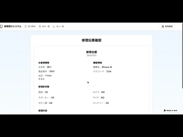 修理伝票生成: 自動的な受付番号生成と伝票作成